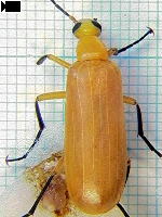 被害 幼虫はオオハキリバチなどのハナバチ類に寄生するという。成虫は花上で見られるほか場所によっては夜、明かりに飛んでくる。成虫は美しい鮮黄色であるが、つかむと体液を出し、皮膚に付くと水泡ができてヒリヒリと痛む。 対策 アオカミキリモドキに同じ。 |